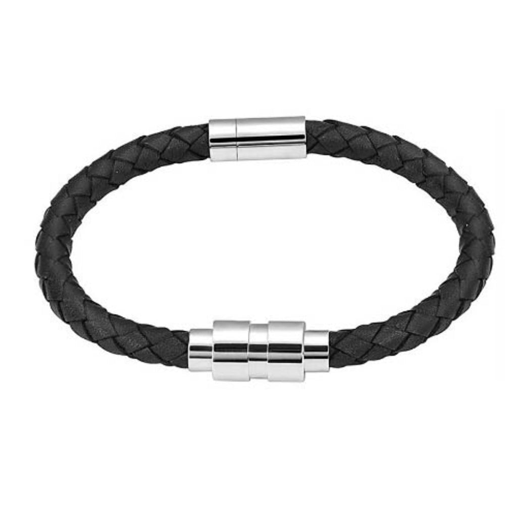 J-BRAC-06- Pulsera trenzada de cuero negro con broche de plata -7.25"