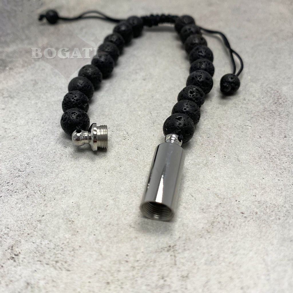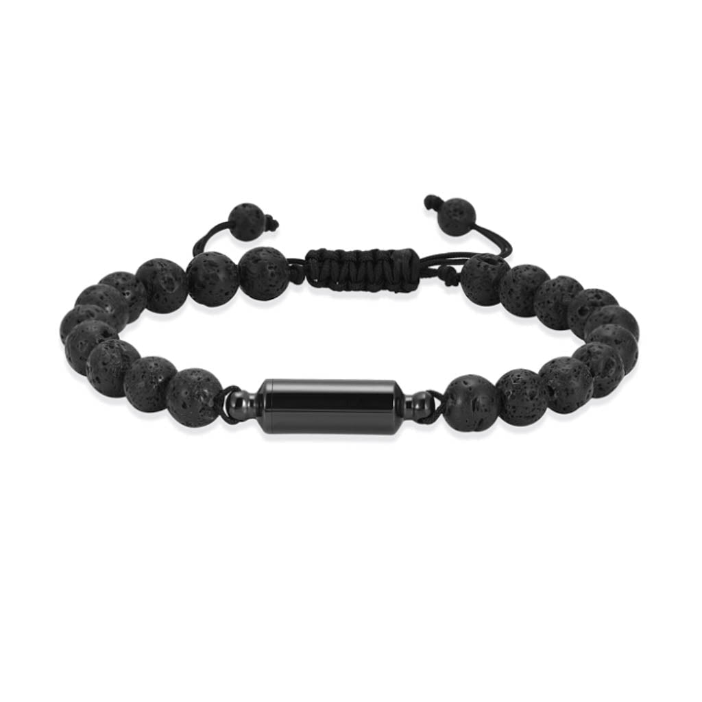 Cuentas de piedra de lava volcánica genuina se tejen juntas para sostener las cenizas más importantes en un cilindro plateado de acero inoxidable. Diseñado para muñecas más pequeñas, los cordones del brazalete se ajustan para agrandarse.